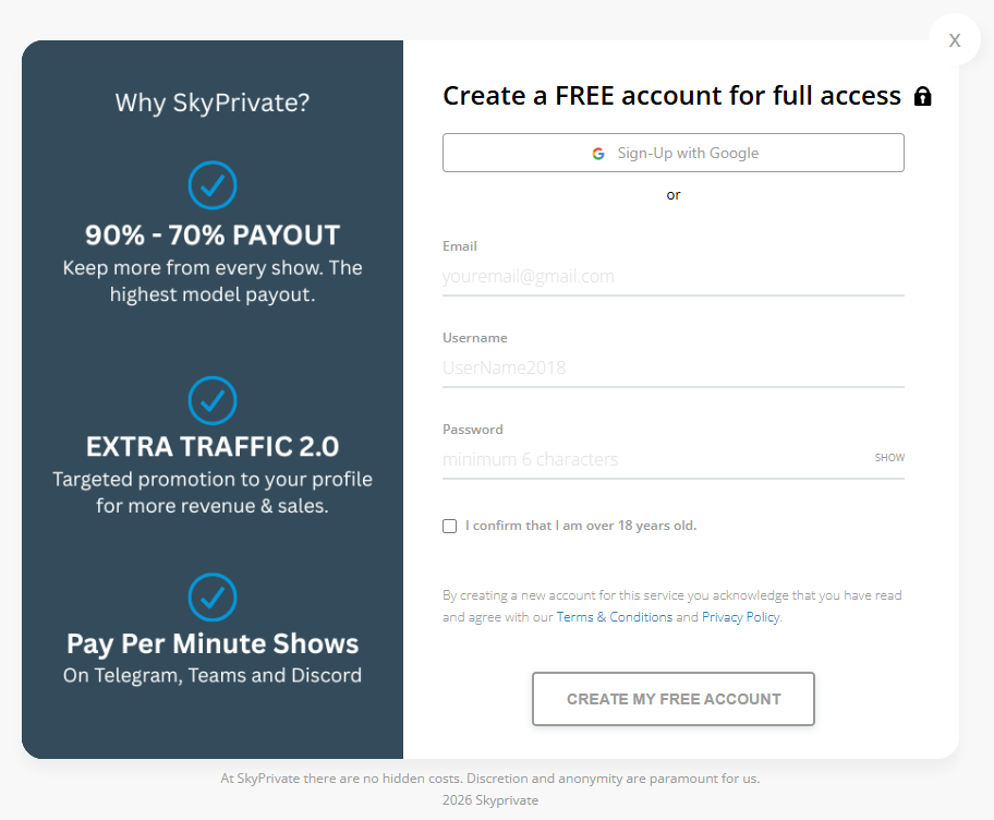 SkyPrivate is open to anyone, regardless of their sexual orientation or fetishes. Everybody can become a SkyPrivate webcam Model and get more money from private Teams, Discord, and Telegram shows.